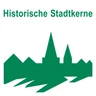 The route is signposted throughout with a green city silhouette on a white background and the sign "Historische Stadtkerne - Route Münsterland".