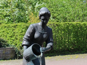 At the next crossroads, turn left into the avenue and continue through the entrance to the historic Kurpark until you reach the Ballhaus. Princess Pauline is sitting on a bench right in front of it.Now continue straight ahead, turn right at the fountain temple and after a few meters leave the Kurpark again. Keep left at the exit. Here you will discover the next monument, the bathing lady in front of the Roseklinik. At the next junction, turn left again into Parkstraße. Halfway along, you will see the last monument on this tour, the Simon August Monument.