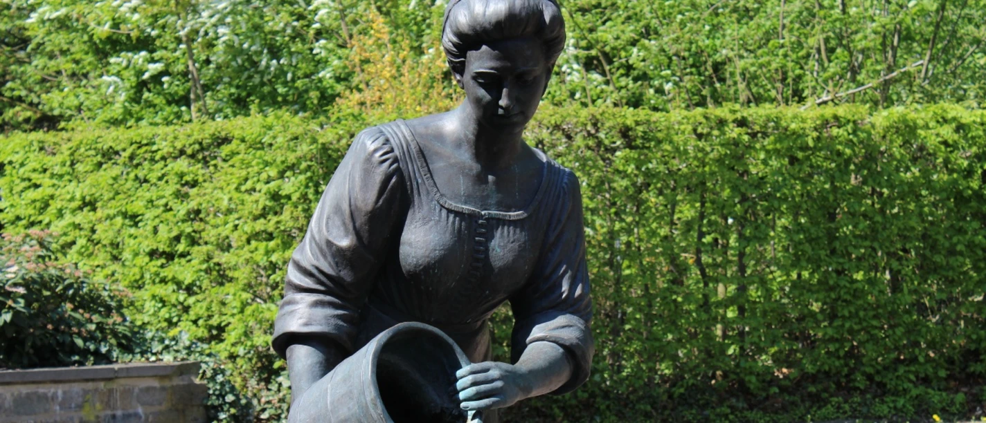 The function of the tub is visible through the steps, a bronze bathing woman pours water into the tub, later this bathing woman served as a fountain with tiny fountains, then as a flower pot.