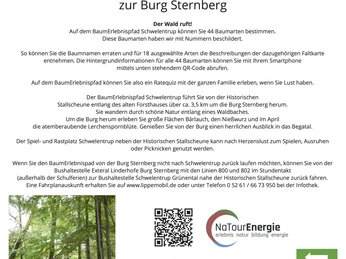You can identify 44 tree species between Schwelentrup and Sternberg Castle. The tree species are labeled with numbers. You can find background information on the Tree Adventure Trail in the folding map or at www.natourenergie.de. You can also book a NaTourErlenbis guided tour with a forester on the Tree Adventure Trail.