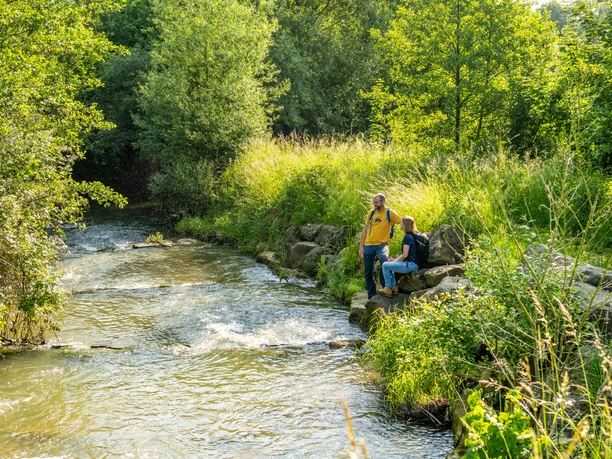 East of the railroad viaduct, the Johannisbach valley is an extensive, open cultural landscape with a meandering stream and large areas of pastureland at the bottom of the valley and arable farming on the slopes. From the walking paths around the Johannisbach floodplain and the Jerrendorf landscape park, you can enjoy beautiful views over the agricultural valley, the Teutoburg Forest and the two old farms Meyer zu Jerrendorf and Wehmeyer.