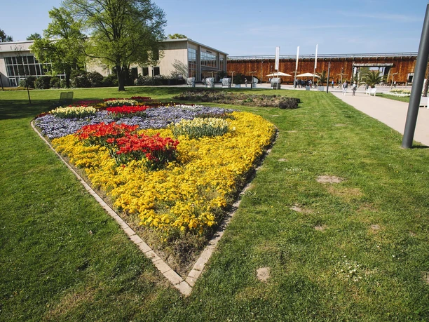 In the rustic entrance area of the accessible graduation house, a solid wooden staircase leads to the viewing platform. From there, you can enjoy wonderful views of the entire graduation house ensemble and the spa architecture of Bad Salzuflen as well as the spa gardens.