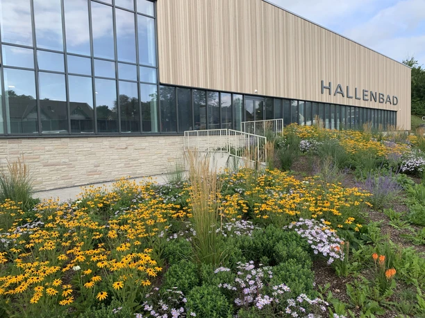 The attractively designed and modern swimming pool on the corner of B64 - Lütmarser Straße offers five 25-metre lanes and a diving platform in the swimming area. A training pool with a lifting floor and a children's area round off the facilities.