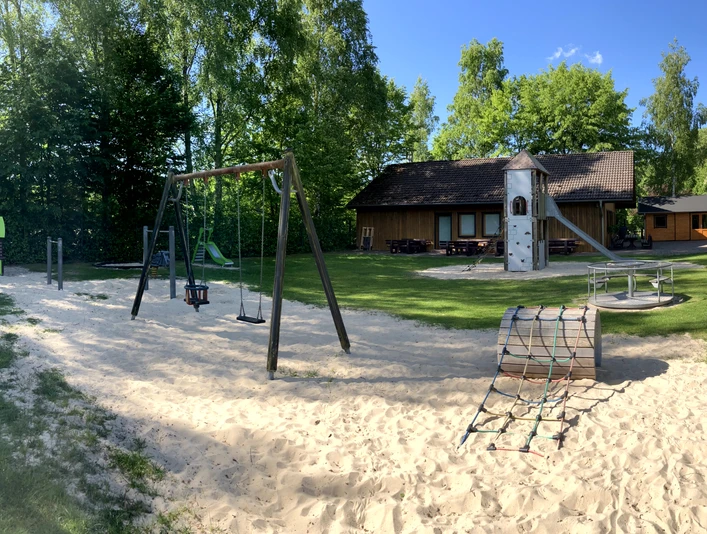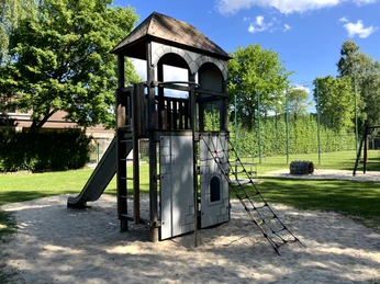 village community center. The playground is located on the edge of the village and adjacent to the neighboring fields. It is surrounded by a fence, partly by a ball fence and has an entrance. Parking is available in the residential area.