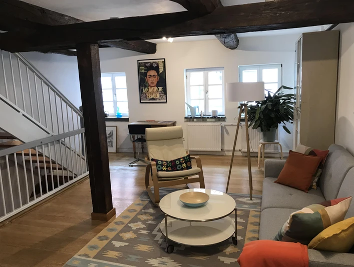 On 3 floors (80m²) there is a fully equipped kitchen with dishwasher and microwave, as well as a guest WC and a conservatory (ground floor). The living room with sofa bed and satellite TV is located on the 1st floor. The bedroom with double bed and the bathroom with rain shower are on the 2nd floor.A house for individualists for sole use in a very central location in a small, quiet alley at Johanniskirchhof.