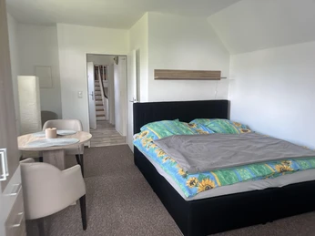 The apartment is approx. 32 m² in size, is located on the 1st floor and is in a quiet location. The apartment has a living room and bedroom with a spacious closet and a box-spring bed measuring 1.80 meters. The windows have pleated blinds and an external blind in the living room and bedroom.