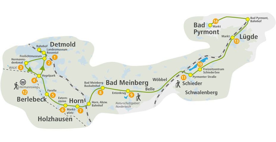 Cultural destinations, natural regions, hiking and cycling trails can often be reached comfortably and relaxed by train and bus. Smart travellers combine their cycling or hiking trips with these modes of transport, travelling from place to place in an environmentally friendly and inexpensive way. Some of the railway lines in the Teutoburg Forest run almost parallel to hiking trails or along well-developed cycle paths.